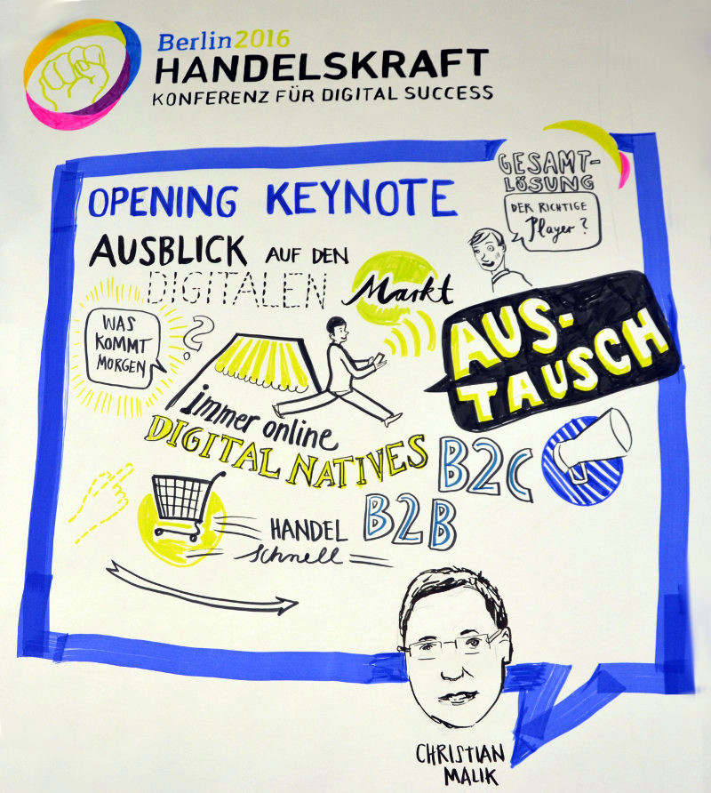 What is needed for digital success? Let’s review the Handelskraft Conference 2016! Posted on 24. February 2016 | by Christian Otto Grötsch Foto: Matthias EimerThe Handelskraft Conference 2016 – #HK16 – was a high-voltage event from the beginning till the end. Supported by eventtool24 an astonishing location, the Classic Remise Berlin, provided the background for our conference for digital success, combining a magical mixture of retro motors and car design classics with urban industry modernity inspiring the almost 100 attendees, and putting the perfect frame to discuss and generate interesting debates about the present and future of digital commerce. Figures never lie: eleven sessions deepened the most trending digital-commerce topics, around 200 tweets generated a successful online exchange and four strong sponsor players: Adobe, FACT-Finder, ShopLupe andTrusted Shops. Let’s dive deeper into the conference’s topics, giving you an overview about the key trends of business success in digital commerce. Framing the Conference – Customer first! Illustration: Graphic Recorder Anne Lehmann dotSource’s founders and general Managers Christian Malik and Christian Grötsch framed the conference. In his opening keynote Christian Malik gave a brief introduction about the processes behind digitisation and digital transformation. He underlined the increase of connected digital technology changing the way people and societies think and act. It’s no exaggeration when he tags the era we live in as the „digital revolution“. The data produced in the past two decades and the amount of digital devices predicted for 2025, including billions of sensors, accelerate the change of our habits and expectations. What’s needed is a shift in business models, focusing on customer relation and communication. Illustration: Graphic Recorder Anne LehmannUser experience, agile methods and adapting to trends is what Christian Malik identified as the main challenges for business success in the future. That’s where Christian Grötsch completed the picture in the conference’s final keynote. Behavioural changes and unconventional customer expectations triggered by smart devices and convenient services force businesses to develop instant commerce strategies. Even if your product or your offering is the best in competition your ability to fulfil at the right place at the right time is becoming crucial for success. The timeframe between shopping and using a product is expected as small as possible by most customers. In order to do so, brands need to align all processes and think big. Progress is not an option – it’s becoming a necessity. Customer Success Stories – never stop progressing A vital exchange with commerce experts is a valuable inspiration for most business deciders. However, it’s often hard to integrate the general findings and strategy proposals into the own business reality. Here’s where Bernd Behrens from 4CARE and Phillip Harm from WÜRTH shared hands-on insights with the audience. Both speakers proposed to stop differentiating between B2B and B2C in the first place. Instead, B2P – Business to People, in their opinion is the future’s claim.Illustration: Graphic Recorder Anne Lehmann Sure, B2B and B2C often have different priorities, but the potential to learn from one another is incredibly high, for example when thinking about same-day-delivery, cross-channel strategies, and a convenient customer experience. They had even more topics in common, so let’s focus on the ones having the strongest business impact. Firstly, 4CARE’s Bernd Behrens showed how mobile usability improvements increased conversion rates and revenues. WÜRTHs Phillip Harm promoted a user-centric shopping experience as well. If you don’t know when and how your customers shop your products, usability improvements can only be created via trial and error. Decreasing cost and increasing revenue can only be achieved by a strong customer-first approach. Illustration: Graphic Recorder Anne Lehmann Secondly, both promoted to choose technology from an ability to experiment perspective. Rolling out new brands, products, or services needs to be easy because it enables businesses to test new ideas at low cost and increases learning speed. Bernd Behrens and Phillip Harm highlighted the importance of gaining and sharing knowledge in the whole organization. The different business units and departments of a brand need to work together closely. They agreed that it’s necessary to „connect the disconnected“ in order to drive nowadays’ change. The Sessions – Broaden the Horizon Illustration: Graphic Recorder Anne LehmannJohannes Altmann from Shoplupe opened the session part of the day with his speech „Du bist, wo du kaufst!“ focusing on the paradoxal customer whose unique lifestyle allows him to care about his body condition riding a €8000 e-bike while consuming junk-food during work. Subtle differences are what successful retailers need to focus on when it comes to personalized offerings. Trust is becoming the new currency in commerce, taking into account the social and emotional components of a purchase and the importance of a customer’s lifestyle that’s connected to the probability of recommending a store, shop, or brand. Illustration: Graphic Recorder Anne LehmannSix further experts were invited to share their insights during two sessions the attendees could choose from. The variety of topics was chosen to inform and inspire. By this time, it was clear that customers nowadays are both: challenge and chance for business success. Digital brands need to keep an eye on a convenient shopping experience along the whole customer journey. The session-speakers impressively showed what options and helpful tools online vendors can individually choose from to create AMAZON-like customer service and growth-rates, which are benchmark for digital brands (Adrian Hotz – A. Hotz E-Commerce Beratung). Illustration: 